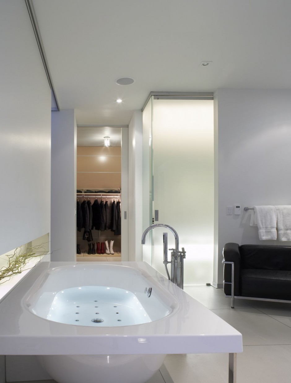 Walled dividers separate the wide open spaces into homier, more manageable spaces and an in living room fireplace sits below a divider that doesn’t quite touch the floor, leaving it visible from all angles of the home. An 800 square foot rooftop is accessible by elevator, and a long cabana like setting with a row of chairs makes celebrating temperate nights feel like paradise on the back side of the residence.Elaine Cecconi és építész irodája nevéhez fűződik ez a több mint 400m2 alapterületű raktárházból kialakított modern minimalista , abszolút otthonos lakás kialakítás amely Torontóban valósult meg. A lakás legnagyobb attrakciója a nappaliközepén felépított nyitott kandalló installáció amely egy úttal térelválasztó szerepet játszik a nappali és az étkező között. Említést érdemel még a minimalista hangvételben megfogalmazott fehér színben pompázó konyhaszekrény és konyhasziget amely légies, tiszta, és áttekinthető modern vonalainak a lakás arculatában is meghatározó szerepe van.